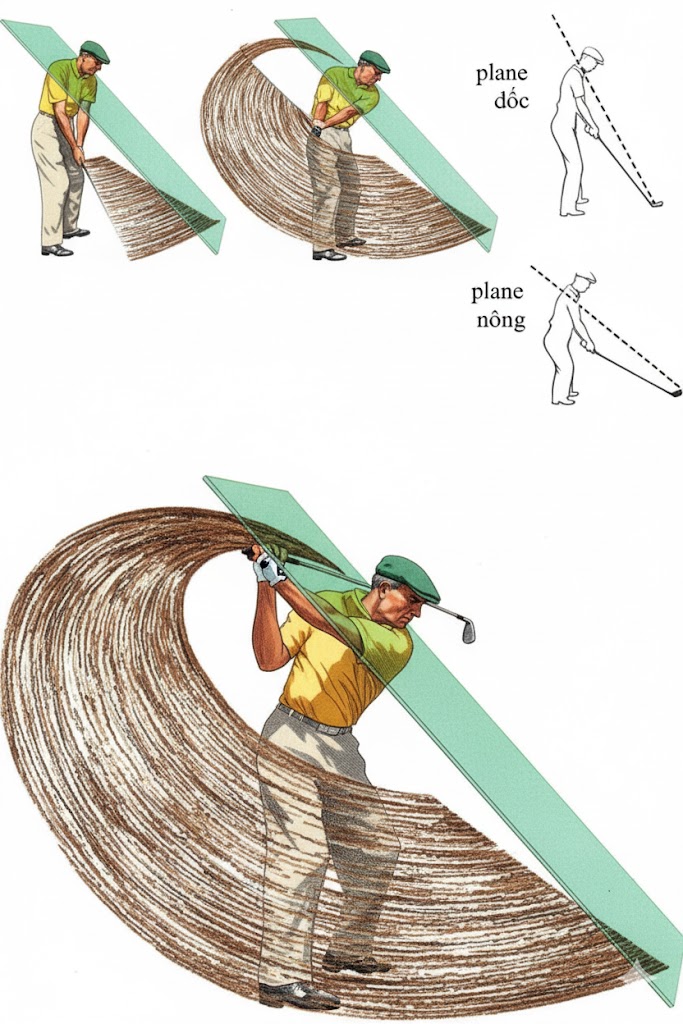Plane backswing là mặt phẳng nghiêng từ bóng lên vai.